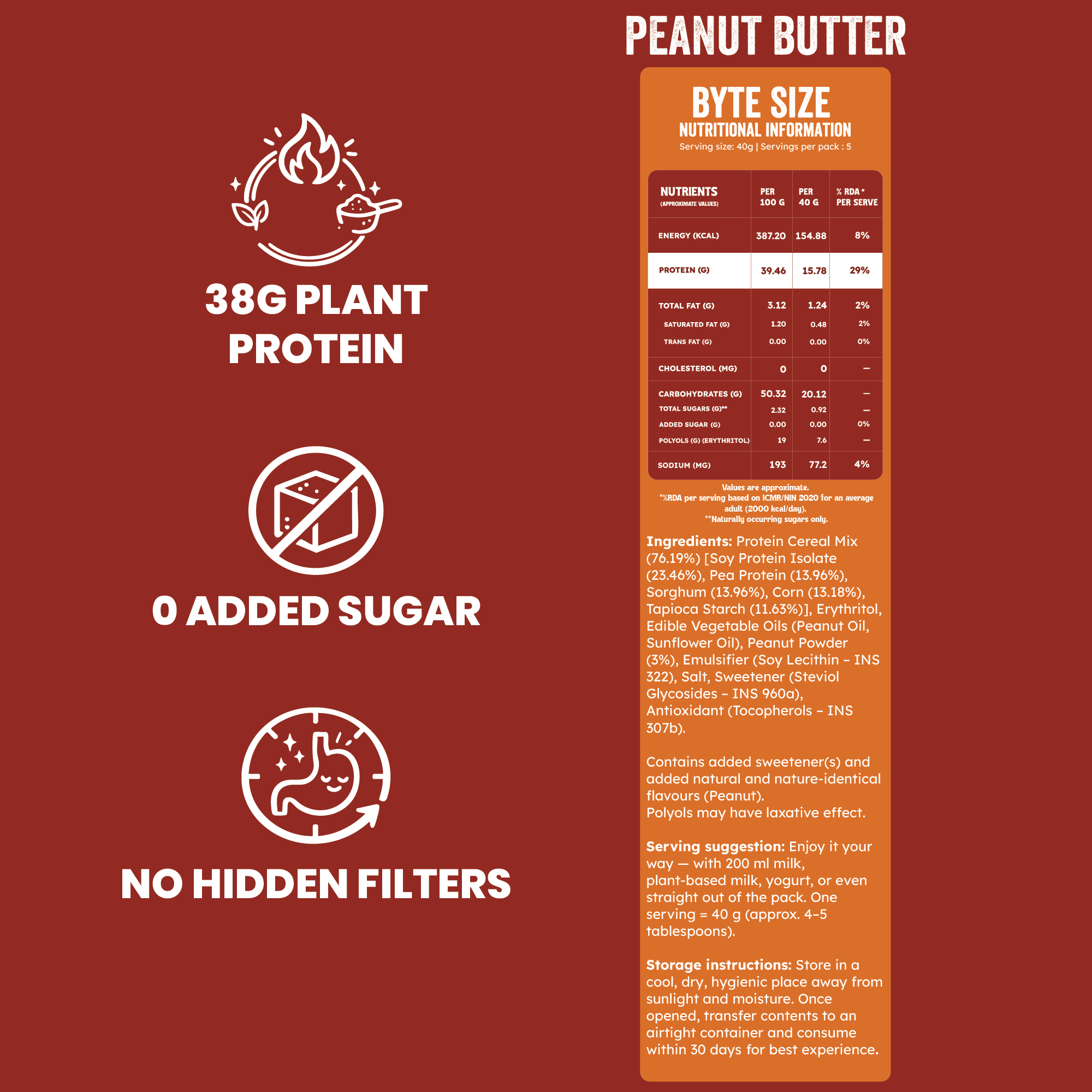 Protein cereal mix (63.5%) [Soy Protein Isolate (26%), Pea Protein (16.5%), Sorghum (16.5%), Corn (15.6%), Tapioca Starch (13.85%)], Erythritol, Peanut Oil, Sunflower Oil, Peanut Powder, Emulsifier (Soy Lecithin), Salt, Steviol Glycoside, Tocopherol (Antioxidant).